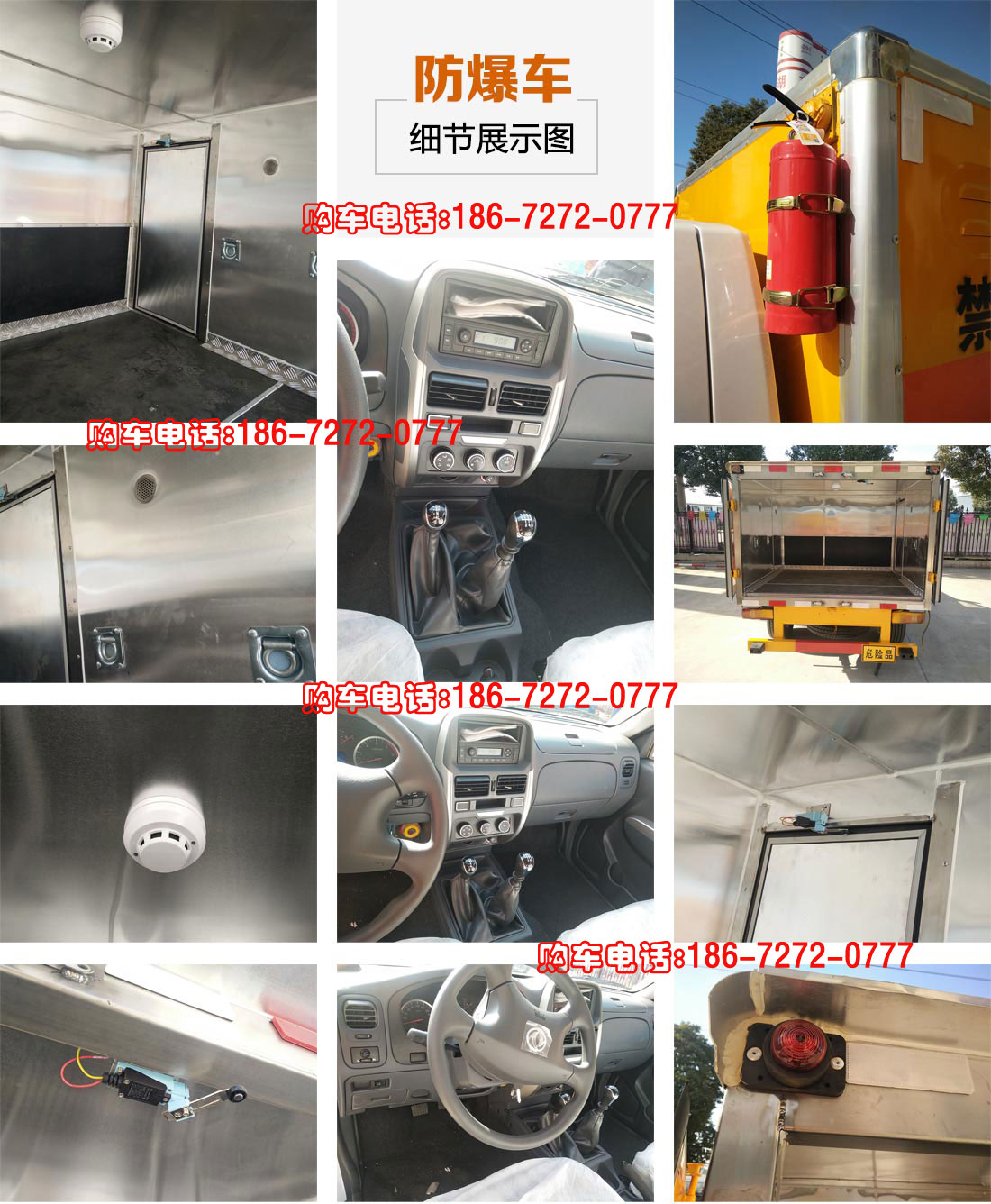 廂體全金屬整體骨架式,車廂壁板的內部材料用導電好、摩擦不起火花的鋁板制作,底板用導靜電橡膠。整車具有外型美觀、強度高、防雨、防火阻燃、防靜電火化、煙火報警和防盜等功能。爆破器材運輸車廂體選開側門和隔艙,特殊車型選裝抗爆容器筒或者雷官廂,專門用于雷官運輸。