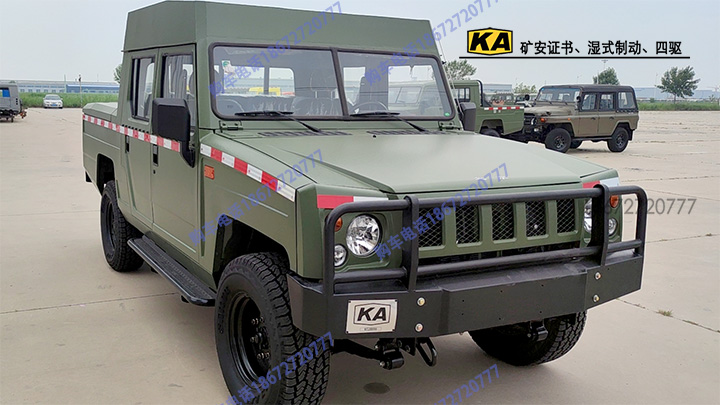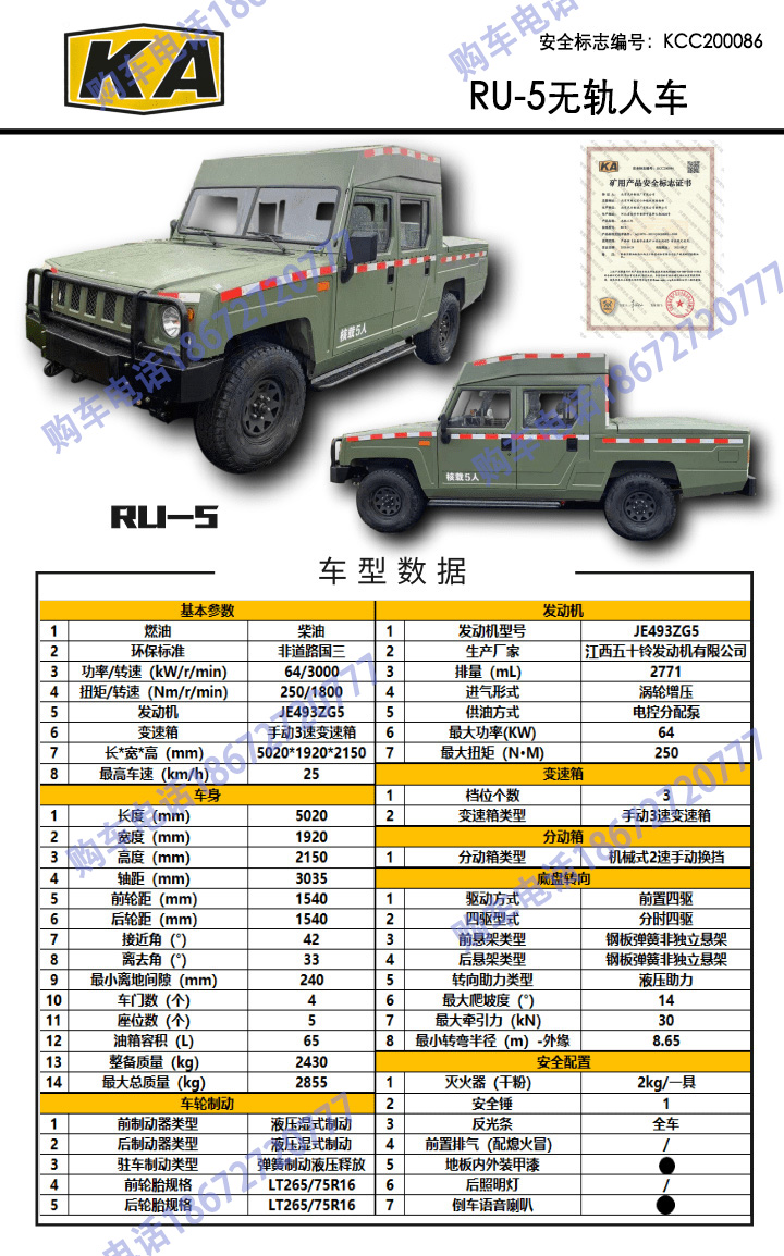 勇士RU-5無軌運人車也叫礦用指揮車|濕式制動運人車|礦安標志皮卡車|井下四驅皮卡車,勇士RU-5井下無軌運人車荷載5人,是針對地下礦山而研發(fā)的井下運輸礦工人員的專用車型,符合最新《金屬非金屬地下礦山無軌運人車輛安全技術要求》的法規(guī)要求,皮實耐用,易于操控,維修費用低。車身全部采用高分子防腐裝甲噴涂工藝,大梁采用電泳油漆工藝,使整車在井下巷道的高濕高熱環(huán)境下更加耐腐蝕,壽命更長更耐用。